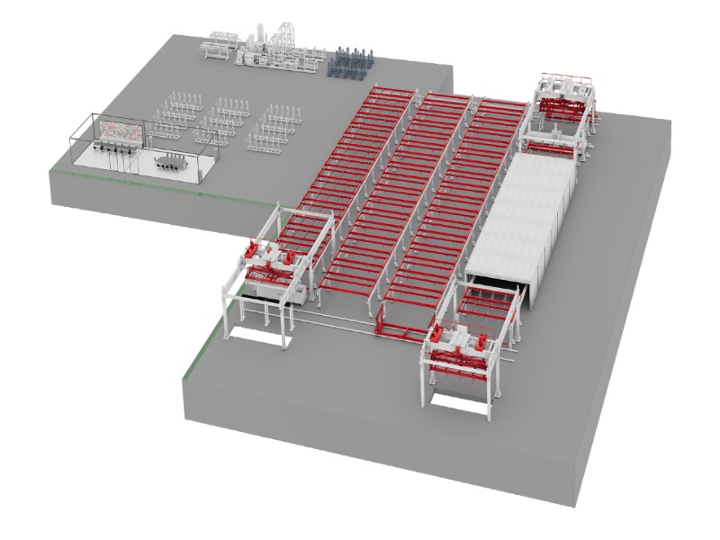 절단 단계는 아마도 AAC 블록 생산 라인에서 시각적으로 인상적인 부분일 것입니다. 전용 크레인이 녹색 케이크의 성형을 해제하고 절단기에 올려 놓습니다.